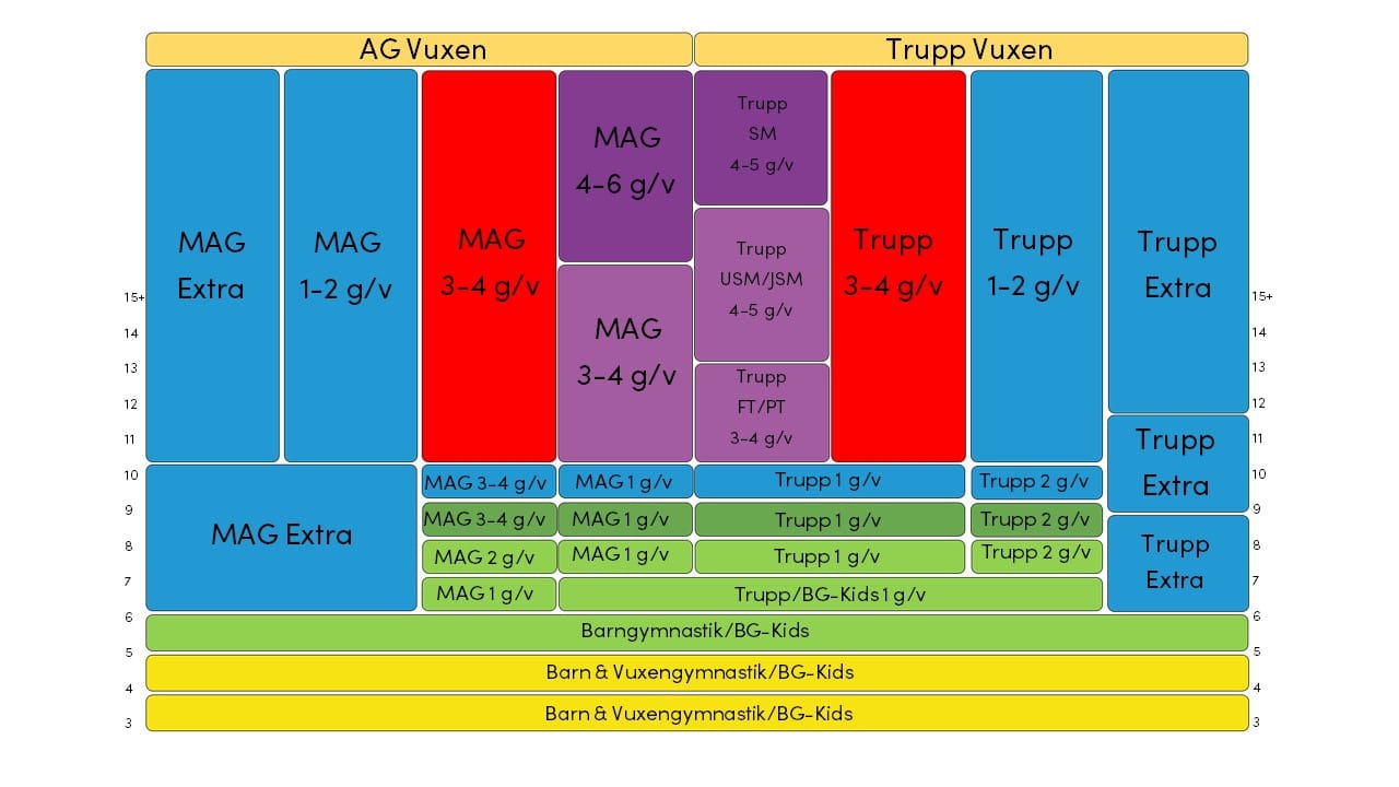 Antalet träningstillfällen per termin varierar beroende på ålder. Vissa lov och helger är exkluderade. Utöver de ordinarie träningstillfällena erbjuds gymnaster från 6 års ålder att delta på extraträningar tillsammans med övriga grupper i samma åldersspann.